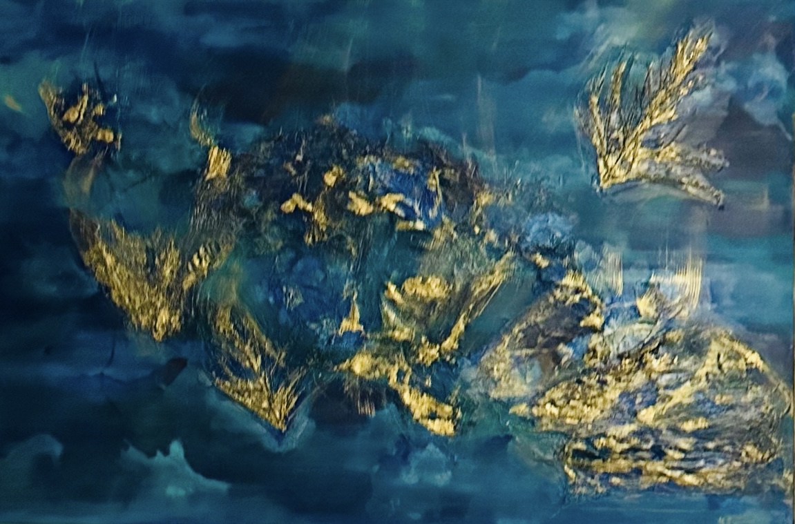 Abstrakt mit Struktur in Meeresfarben und gold.